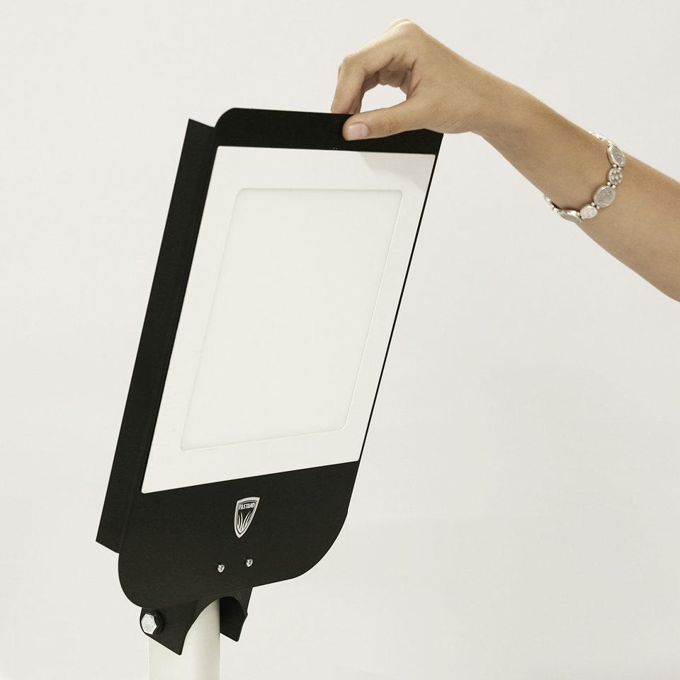 Мы разрабатываем дизайнерский корпус, в который встроен прожектор, чтобы подчеркнуть ценность и выразительность вашего стенда.