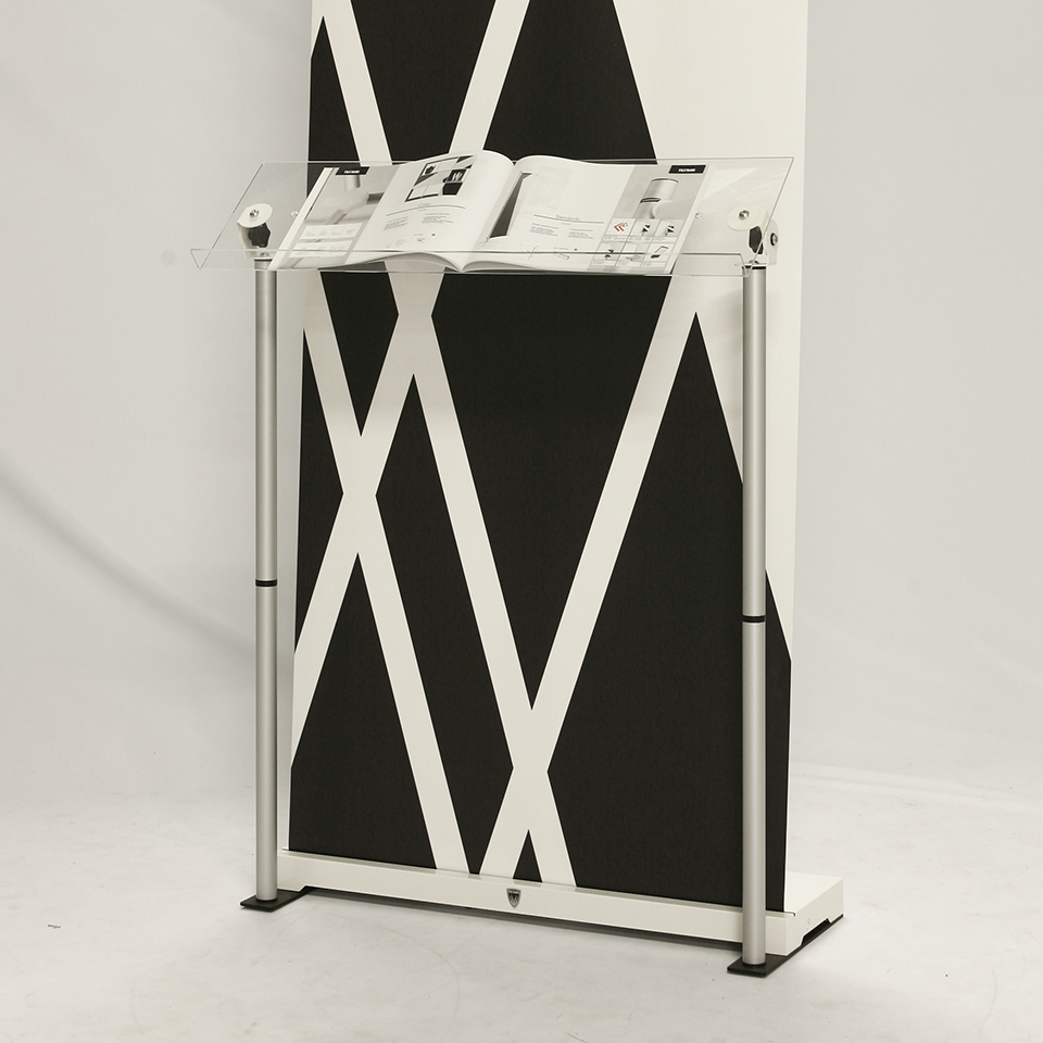 Благодаря поворотным штифтам мы можем регулировать положение полки из плексигласа, создавая плоскую поверхность для продукции или полноширинный держатель каталогов. Практичная и красивая, она выполнена из прозрачного материала, чтобы меньше отвлекать внимание от напечатанной информации на ролл-апе.