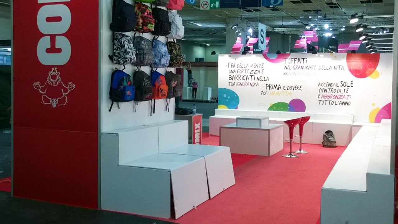 Стенд модульный и компонованный для выставки в Торино a7> книги в Турине для Козимо Панини, с башней высотой a16> высотой 5 метров для использования в качестве помещения склада. По всем периметру мы осуществили установку серии витрин в помещении. a30> серию из витрин в отсеке с открывающейся дверцей , где можно хранить книги во время мероприятия . Корпус изготовлен из алюминия, а покрытие из материала Fastflex.