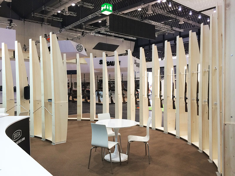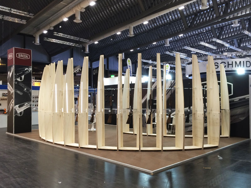 Il progetto dello stand è innovativa e di design: voleva attirare l’attenzione utilizzando elementi lineari e sobri che fungono anche da illuminazione del prodetto esposto. Questi elementi a forma di pinna si elevano verso l’alto e sono stati progettati sono fissati uno all’altro creado una forma circolare quasi a proteggere lo stand e di conseguenza il prodotto esposto. Il progetto prevede che nel conso del tempo dovrebbe cambiare lo spazio fiera, le pinne potrebbero essere fissate anche a forma di esse o altre forme, senza cambiare nessun elemento a disposizione.