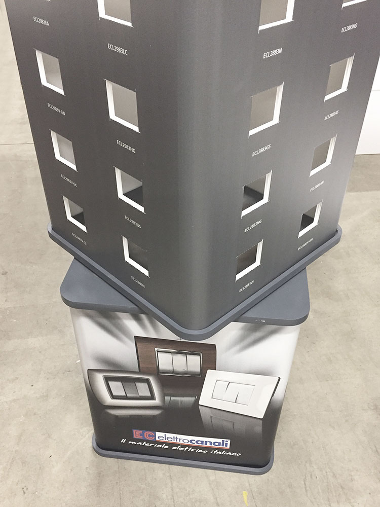 Одно из решений практичных и инновационных, даже для больших размеров, до 200 см в высоту и с системой вращения верхней части для увеличения обзора в обеспечить более широкий обзор производственного ассортимента. Простой в установке и полностью графический, этот стенд переносной имеет особенность в том, что он предусматривает отверстия для вставки пластин в электрическую систему a43> вставку пластин электрической в открытом доступе.