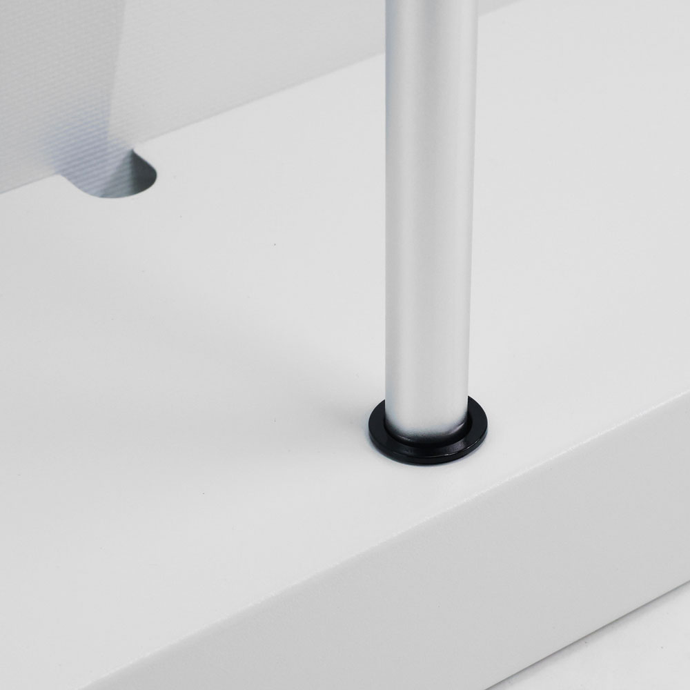 Благодаря поворотным штифтам мы можем регулировать положение полки из плексигласа, создавая плоскую поверхность для продукции или полноширинный держатель каталогов. Практичная и красивая, она выполнена из прозрачного материала, чтобы меньше отвлекать внимание от напечатанной информации на roll-up.